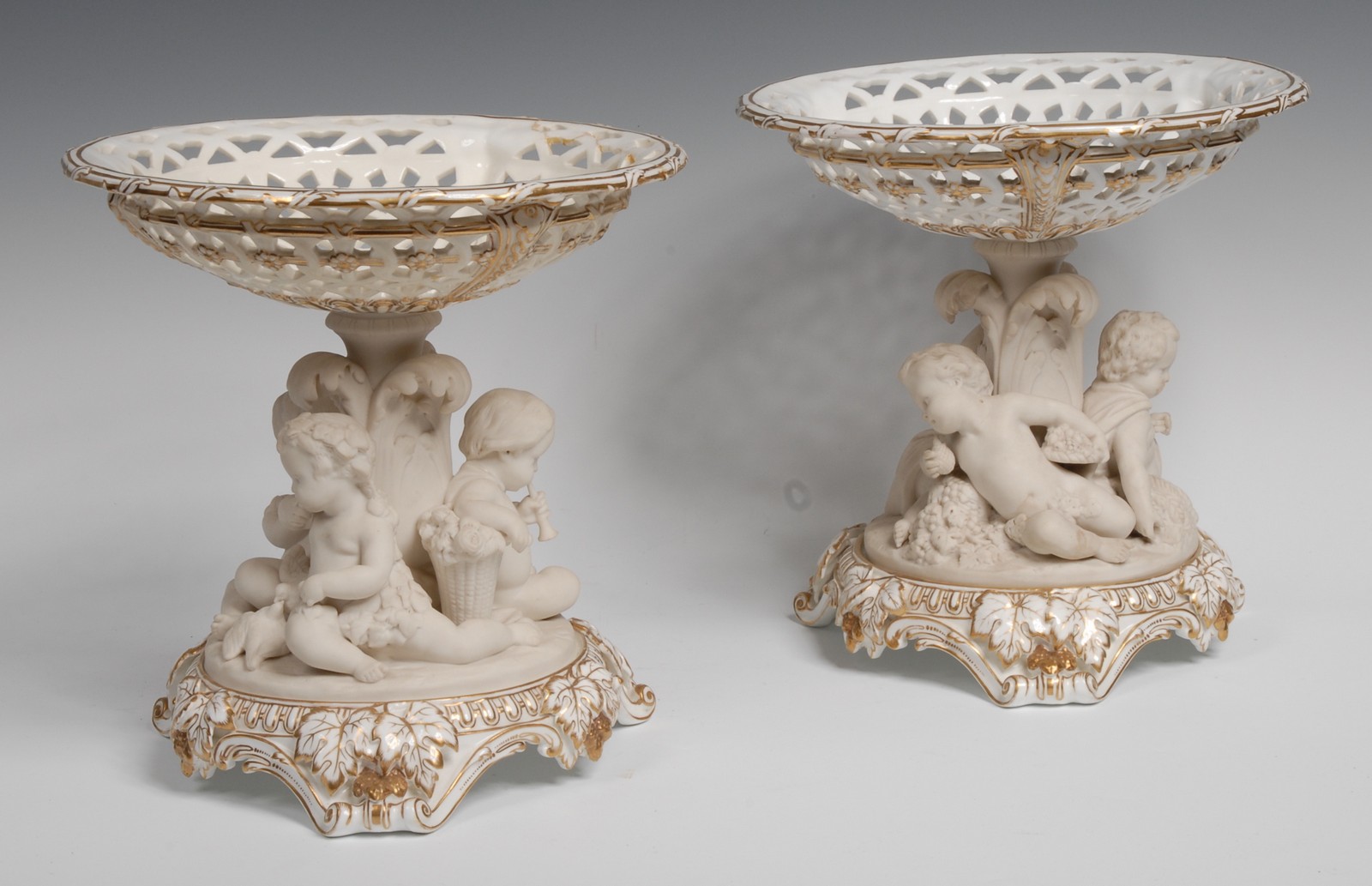 A pair of Victorian Parian and porcelain comports, the pierced bowls, supported by three scantily clad cherubs, Allegorical of the Seasons and Music, ... the base with vine and leaves, picked out in gilt, later cranberry glass bowls