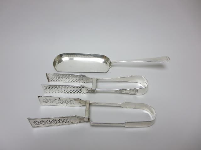 A pair of Victorian silver Asparagus Servers, fiddle pattern, London 1839, maker: W.E., a plated pair and a plated Crumb Scoop