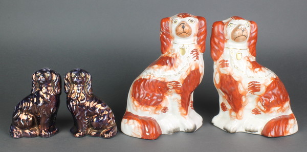 A pair of Victorian Staffordshire ochre spaniels with gilt decoration 9" and a smaller later lustre pair