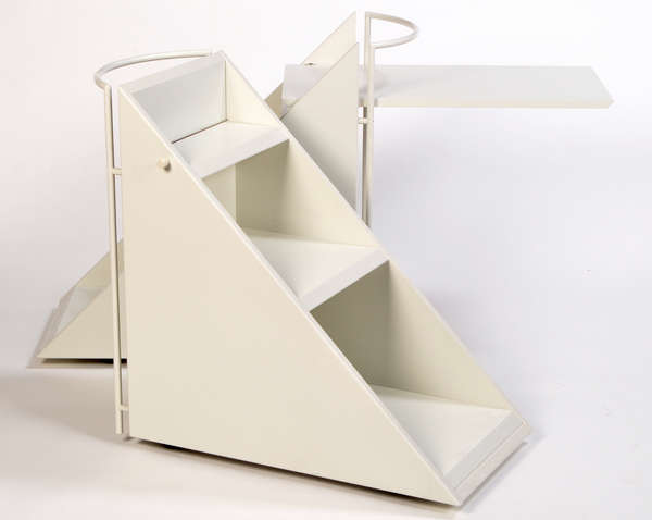 A pair of white coloured library book trolleys, the hinged top folding to form back, mounted by a metal handle
