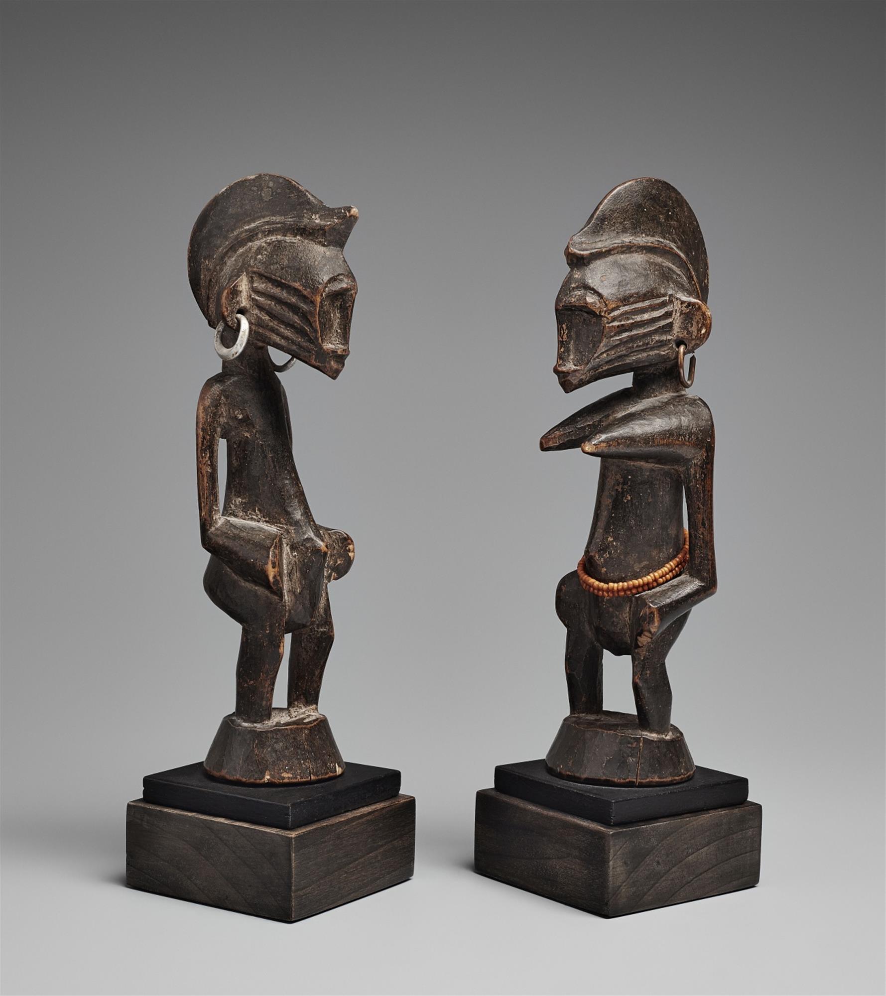 Edan ogboni, male and female, each with hands joined on the abdomen, cast loops about the head and base suspending rattles, the male with a pipe in his mouth.