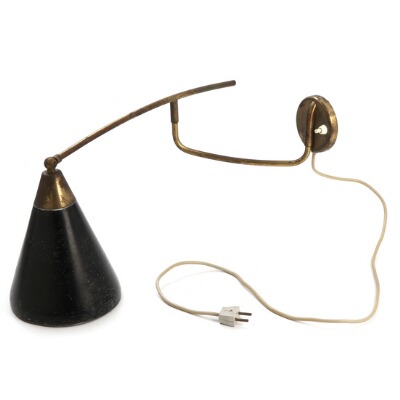 A patinated brass wall lamp with adjustable arm, black painted aluminium shade