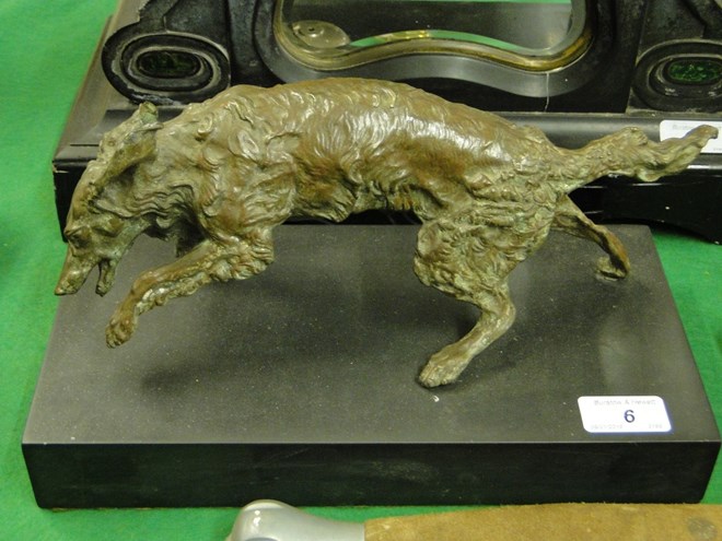 A patinated bronze figure of a running dog, unsigned on slate plinth