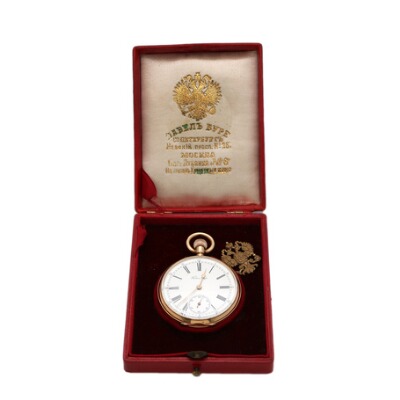A Pavel Bure 14k gold open-face and pin-set pocket watch adorned with the Russian Warrant