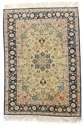 A Persia Isfahan rug, wool on silk, medallion design with entwined branches, flowers and foliage on light green base