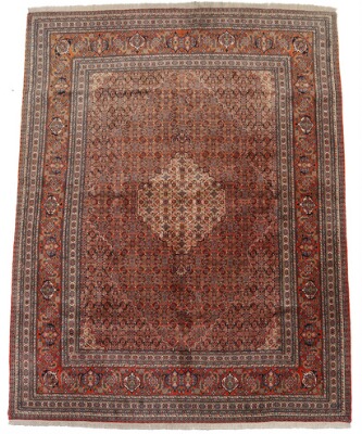 medallion design surrounded with repeating pattern in the shape of ornamentation, flowers and foliage on red base