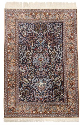 wool on silk, garden design with entwined branches, birds, wild animals, flowers and foliage on blue base