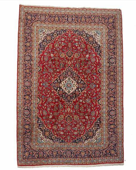 A Persian Keshan carpet, classic medallion design with ornamentation, entwined branches, flowers and foliage on red base
