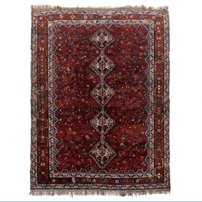 A Persian Luri/ Shiraz carpet, embellished with hooked medallions surrounded with repeating pattern on puce base