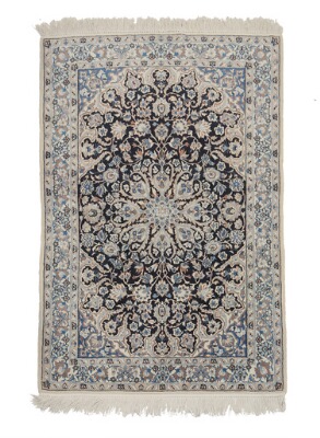 A Persian Nain rug, medallion design with twisted branches, flowers and foliage on blue base. 20th century second half. 191×125 cm.