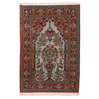 A Persian Qum rug, kurk wool, embellished with oil lamp, vase