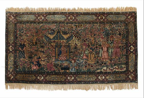 A Persian semi-antique rug, embellished with figures on light base, border with character