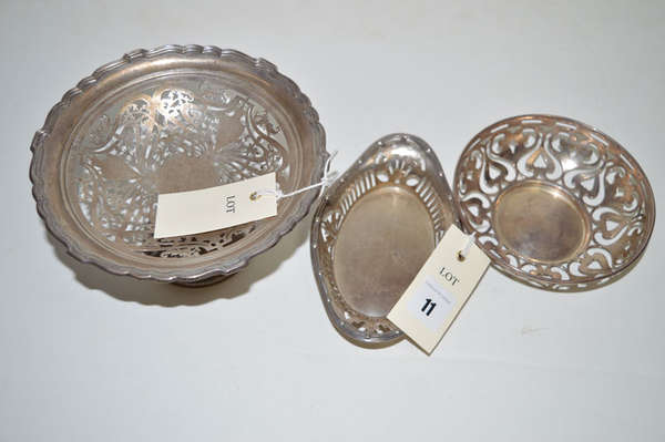 A pierced silver Edwardian tazza, Birmingham 1903, decorated with floral designs; together with a pierced silver bon-bon dish of Art Nouveau design; and a boat-shaped pierced silver bon-bon dish.
