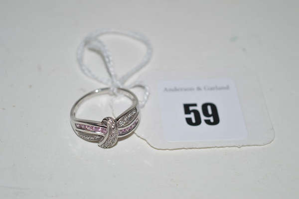 A pink stone and cubic zirconia ring of bow form, in 9ct. white gold mount, ring size P.