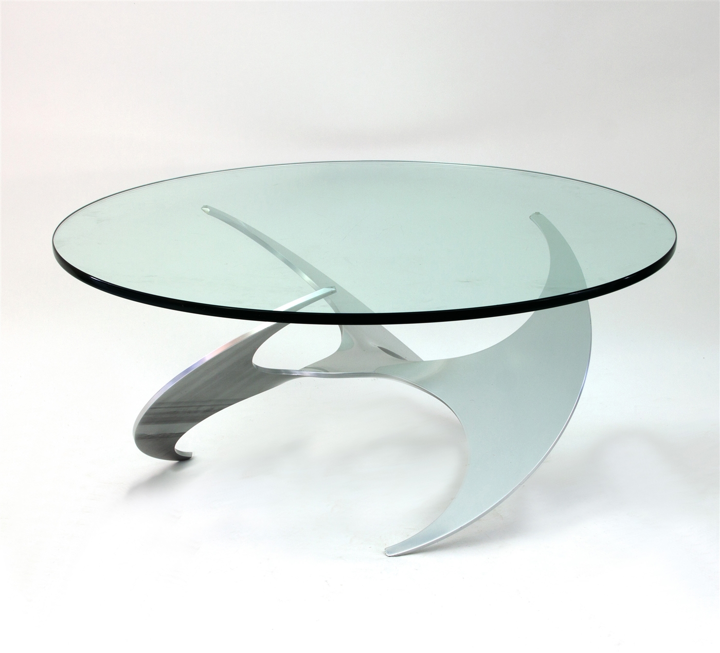 with circular clear glass top and an aluminium propeller base, 109cm diameter