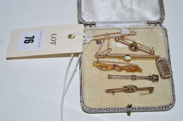 A quantity of brooches, to include: a 9ct. yellow gold bar brooch set blue stone; a half pearl set memorium brooch with vacant central plaque, engraved initials and date to reverse 'HA 1824'; a red stone and seed pearl bar brooch stamped '15ct.'; a y