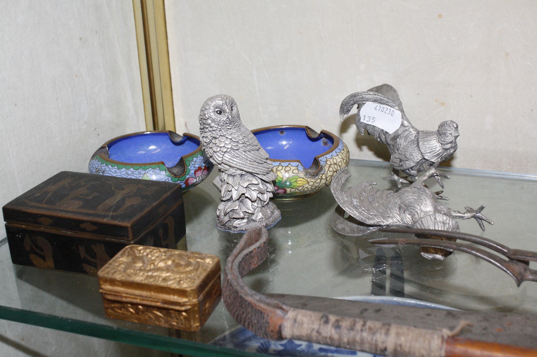 A quantity of collectable items to include a silver mounted model owl, a pair of Cloisonnie ashtrays, silver coloured metal fighting cockerels etc