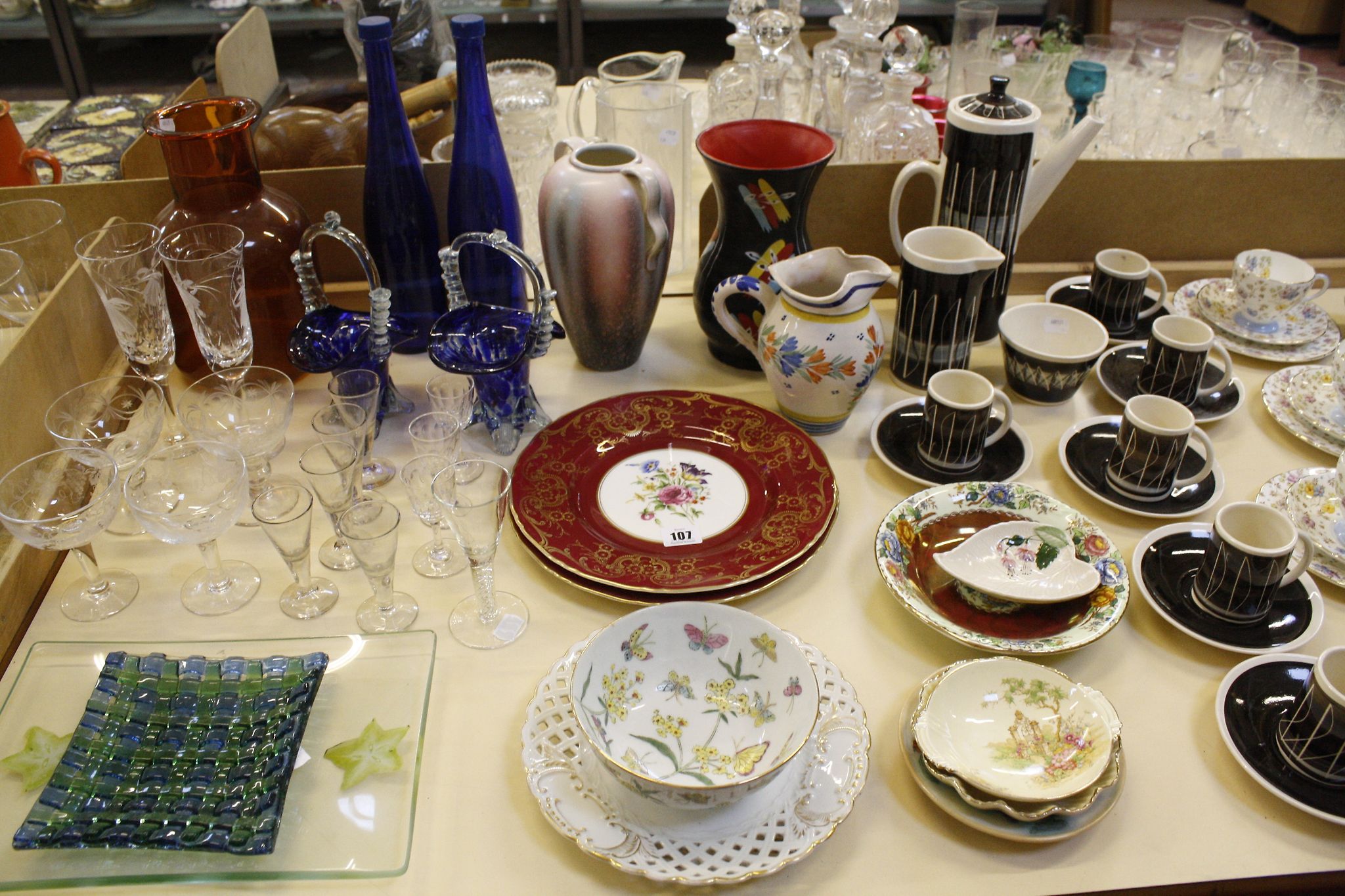 A quantity of decorative ceramics and glassware , to include Llanfair part coffee set, Foley china part tea service etc