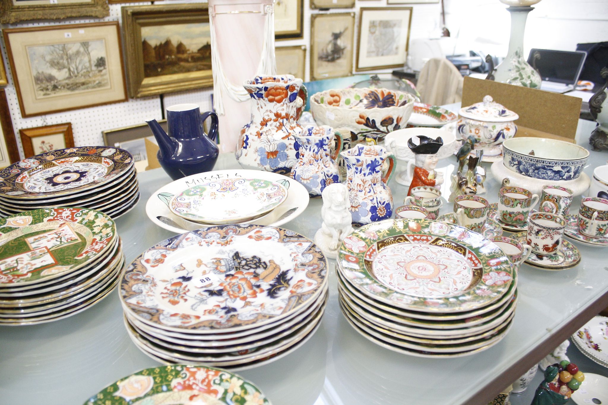 A quantity of decorative ceramics to include Ironstone china, Masons graduated jug, miniature majolica vase etc