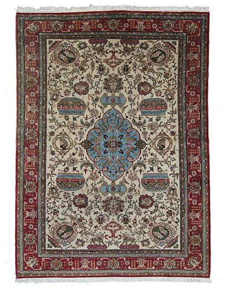 A Qum rug, Persia. Design of entwined branches, bird motifs and the Persian lions. Areas with silk pile