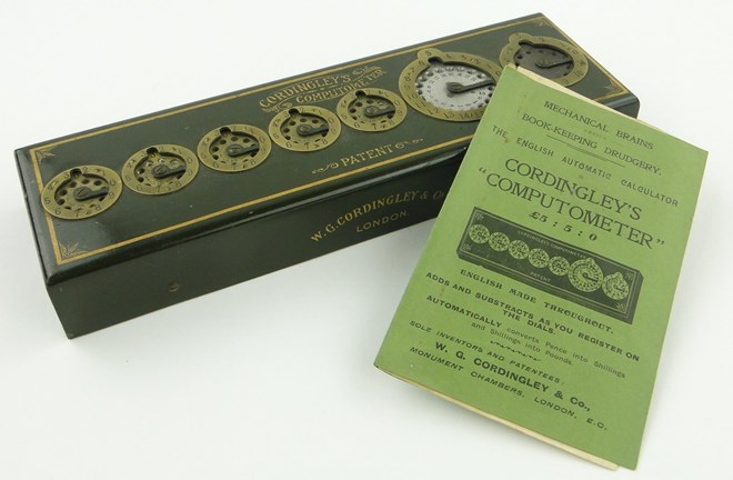 A rare Cordingley's computometer mechanical adding machine, the gilded metal case having 7 brass mounted inner dials, circa 1910, length 10.5'' with original instruction manual.