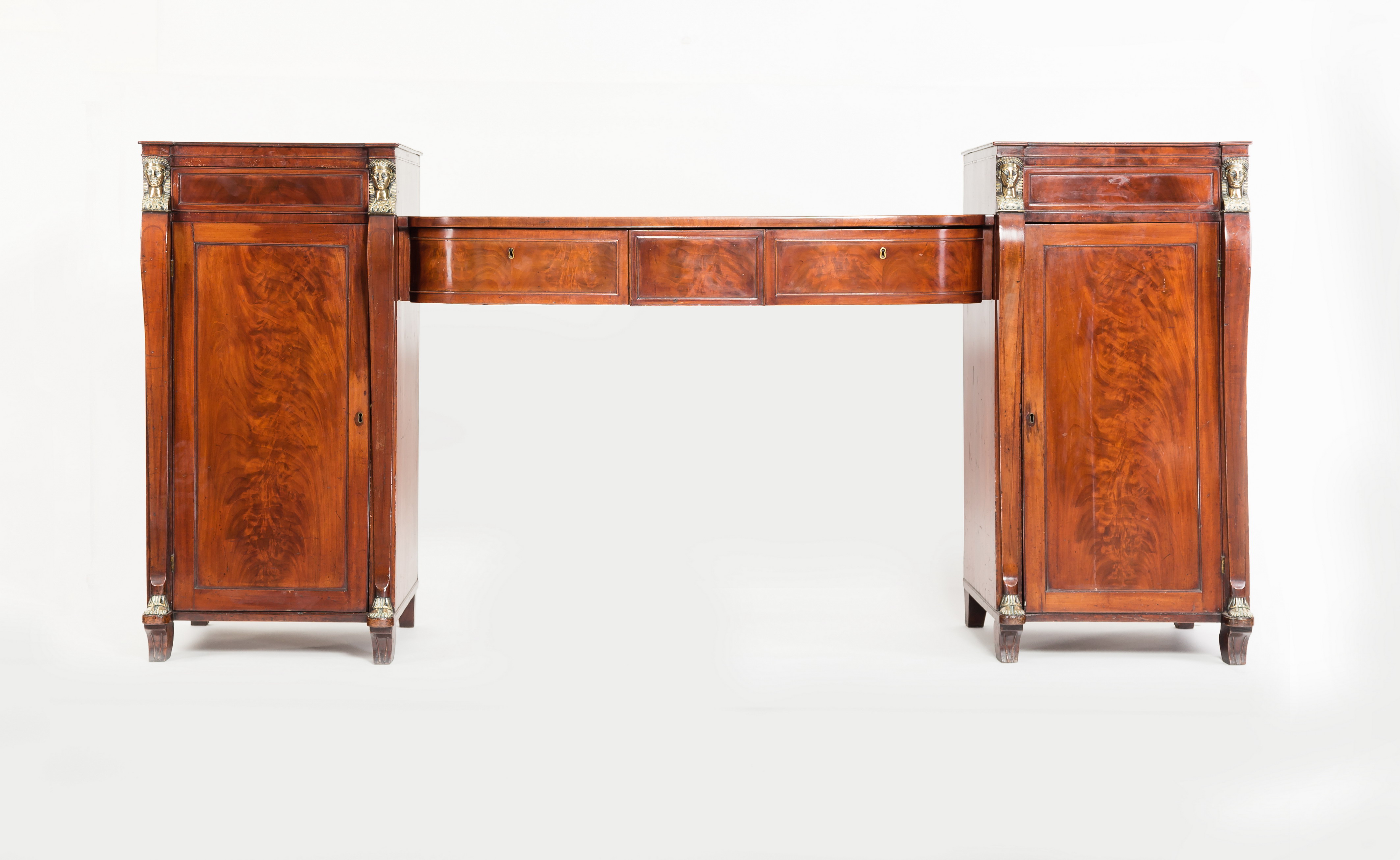 A Regency mahogany pedestal sideboard, the bowfront top fitted two drawers
