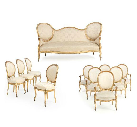 A rococo style giltwood suite consisting of 10 chairs and a sofa