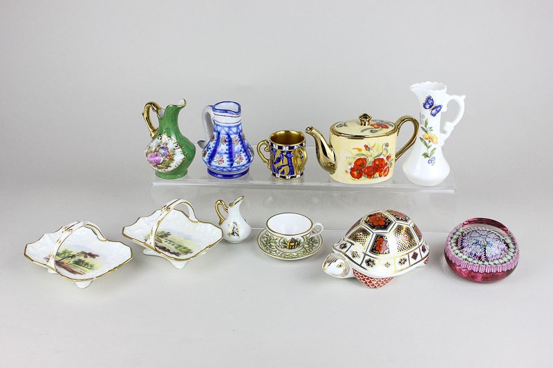 A Royal Crown Derby tortoise paperweight (silver stopper), a glass paperweight, together with various miniature tea ware