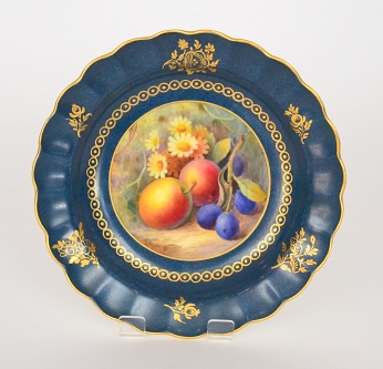 A Royal Worcester fruit painted shallow plate decorated to the central roundel by Martin with peaches, grapes and daisies, the border edge in blue with gilt detailing, signed, blue printed mark with date code for 1913, diameter 20cm