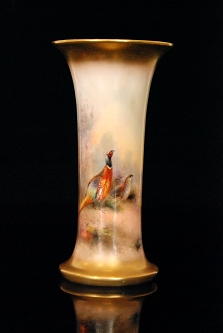 A Royal Worcester trumpet vase hand painted by James Stinton, the body panel decorated with a pheasant and a grouse in a woodland setting, signed, puce mark with date code for 1932, height 23cm