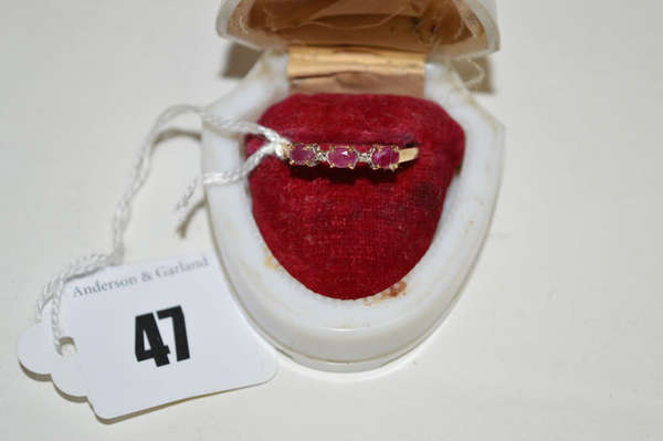 A ruby and diamond ring, the oval facet cut rubies separated by single diamonds, on 9ct. yellow gold shank, ring size R.