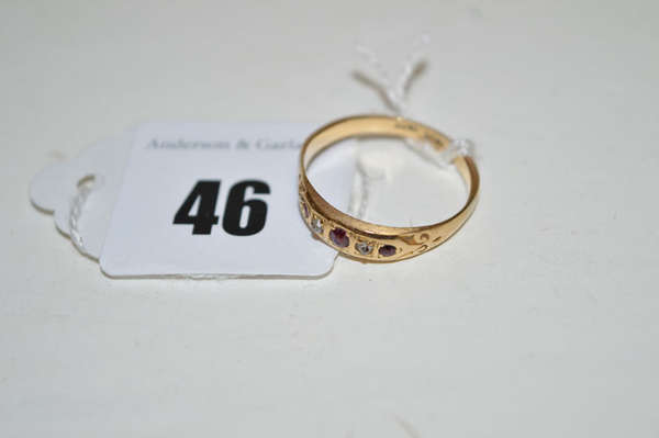 A ruby and diamond set ring, on yellow metal shank stamped '18ct.', ring size P.