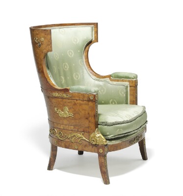 A Russian flamed birch wood and gilt bronze mounted “bergère à oreilles”, curved back and seat with cushion