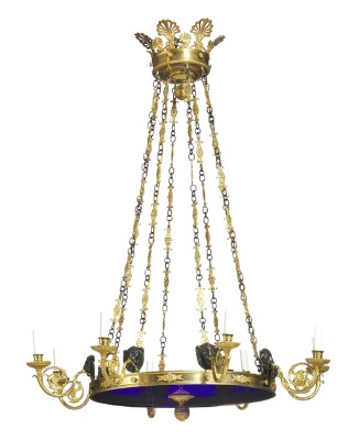 A Russian gilt and patinated eight light chandelier with cobalt blue glass, fitted for electricity