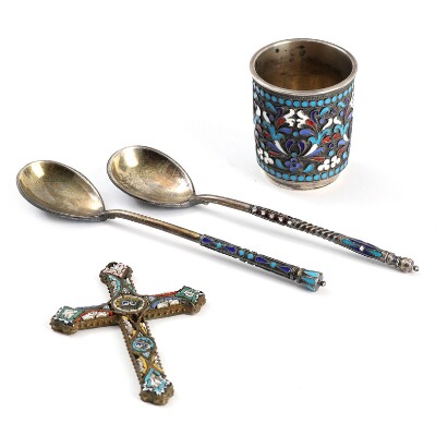 A Russian partly gilded silver and cloisonné enamel “charka” beaker and two tea spoons
