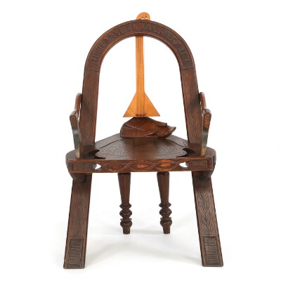 A Russian Revival oakwood and fruitwood armchair, carved with axes, balalaika and inscription