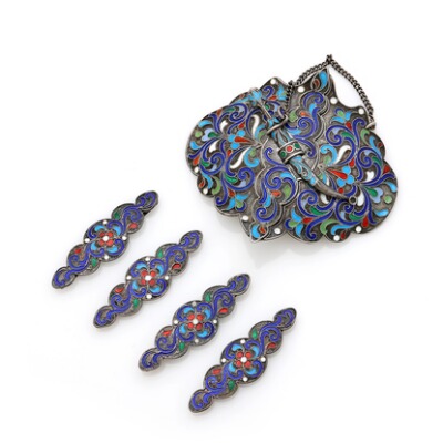 A Russian silver and cloisonné enamel buckle and five loose links