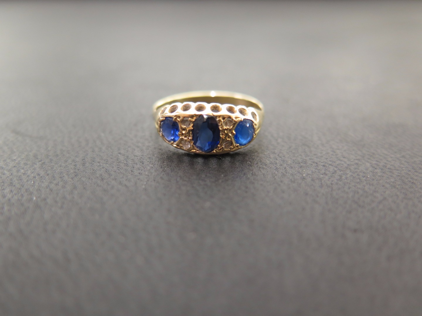 A sapphire and diamond boat-shape ring - Stamped 18ct - Ring size O - Weight approx 2.3gms Condition Report: Good to fair