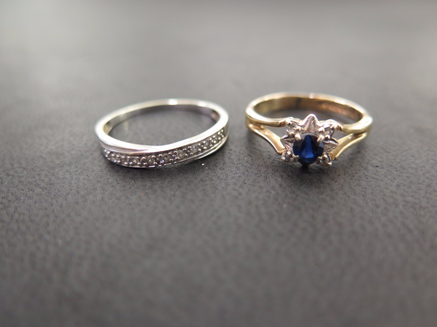 Together with a diamond crossover band ring - Size Q 1/2 - Both with marks indicating 9ct gold - Weight approx 4.0gms Condition Report: Good to fair - With surface scratches - Evidence of sizing to band of cluster