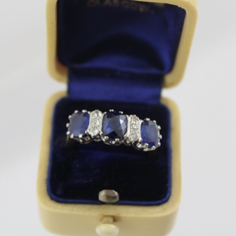 A SAPPHIRE AND DIAMOND RING, set with three cut sapphires repeated by two rows of three brilliant cut diamonds, set on an 18ct gold band, in ivorine ring box, ring size P