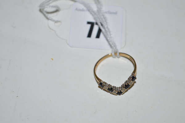 A sapphire and diamond wishbone pattern ring, on 9ct. gold shank, ring size N.