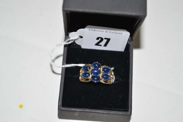 A sapphire ring, set with seven oval cabochon sapphires, in 9ct. yellow gold, ring size M.