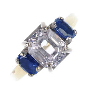 A sapphire three-stone ring. The rectangular-shape pink sapphire, with oval-shape sapphire sides, to the plain band. Ring size N 1/2. Weight 5.4gms.