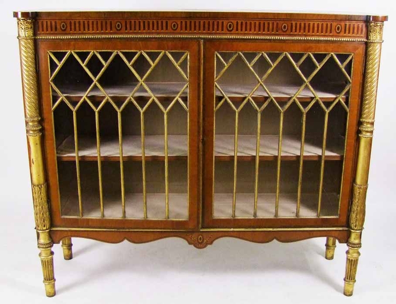 enclosed by a pair of gilt highlighted glazed doors, flanked by acanthus carved pilasters, on turned feet