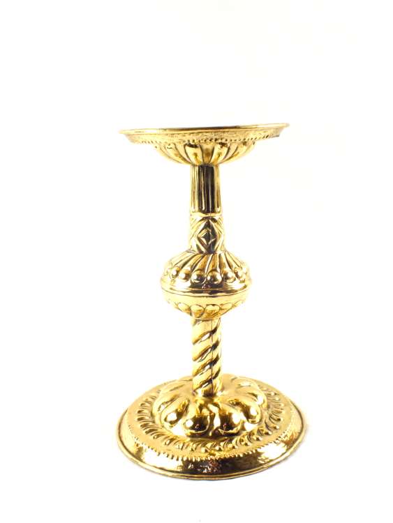 A Scandinavian Arts and Crafts Brass candle stand with repousse decoration and wide circular base
