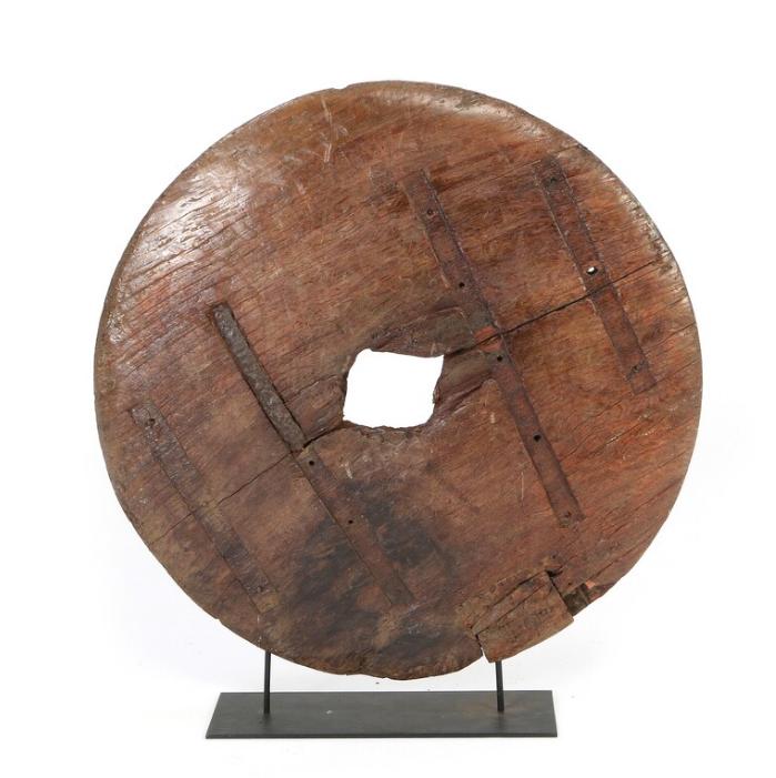 A sculptural wagon wheel made out of a single piece of molave wood.