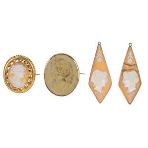 To include a lava cameo brooch, two shell cameo brooches, a hardstone cameo brooch and two shell cameo ear pendant components. One cameo AF. Length of brooches 4 to 2.6cms. Length of components 4.2cms.