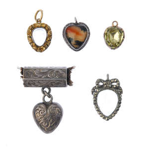 A selection of five heart-shape mid to late Victorian memorial pendants.