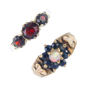 A selection of four 9ct gold gem-set rings.