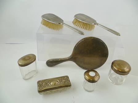 A SELECTION OF ITEMS OF SILVER to include; a hand mirror, two brushes and four glass jars, various